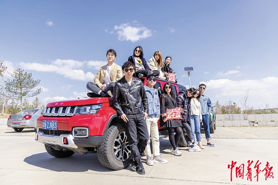 “大学生冰雪体验官”与“大学生冰雪体验营”活动用车北京越野合影。中青校媒记者 郑乾斌/摄