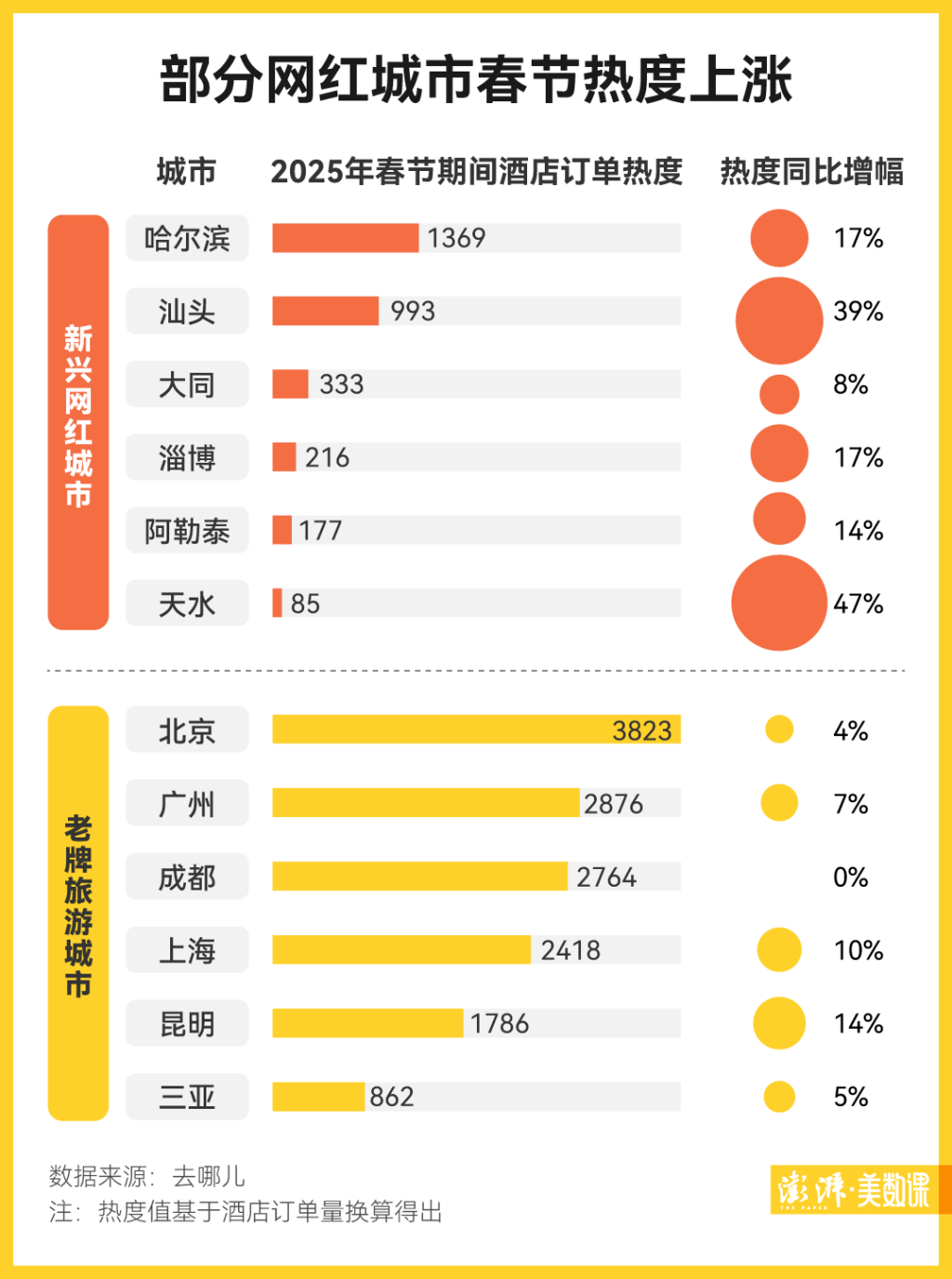 而像是哈尔滨、淄博和天水等新兴网红城市的热度也比去年同期有所增加。