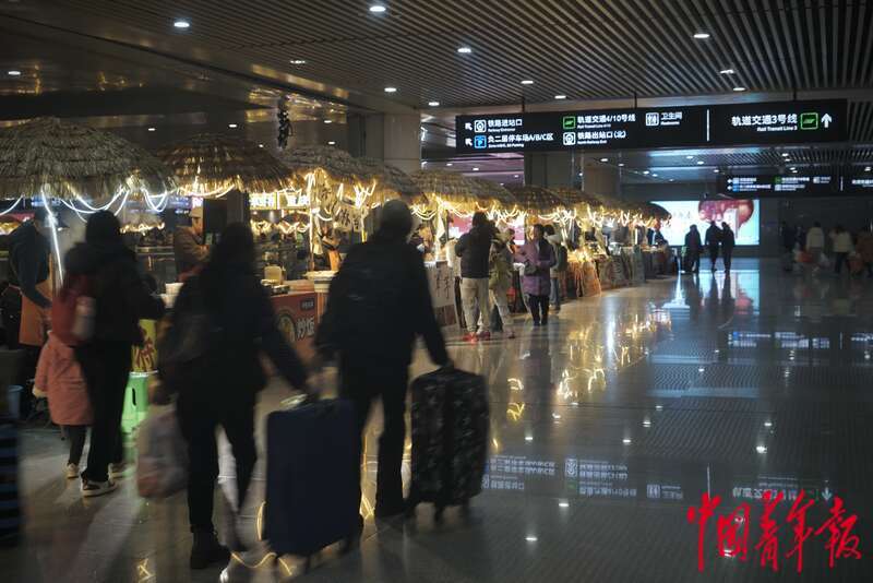 2月5日,重庆市渝北区,拉着行李箱的乘客路过重庆北站北广场地下一层的小市集。中青报·中青网记者 李强/摄