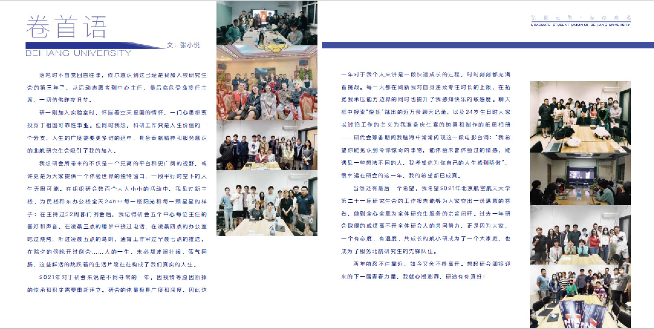 2019年,张悦加入北航研究生会,2021年当选执行主席,随后留任副秘书长,继续参与研会工作,践行“有一份光、发一份热”的承诺。 三届研代会、数百场活动、数百小时的志愿服务时长,构成了 她26岁最闪亮的青春底色。她把系统工程方法运用于学生工作 ,开创性地搭建了线上协同办公的高效体系,2021年统筹全校近380场活动,招募项目志愿者2426人次,组织服务总时长达4477小时。