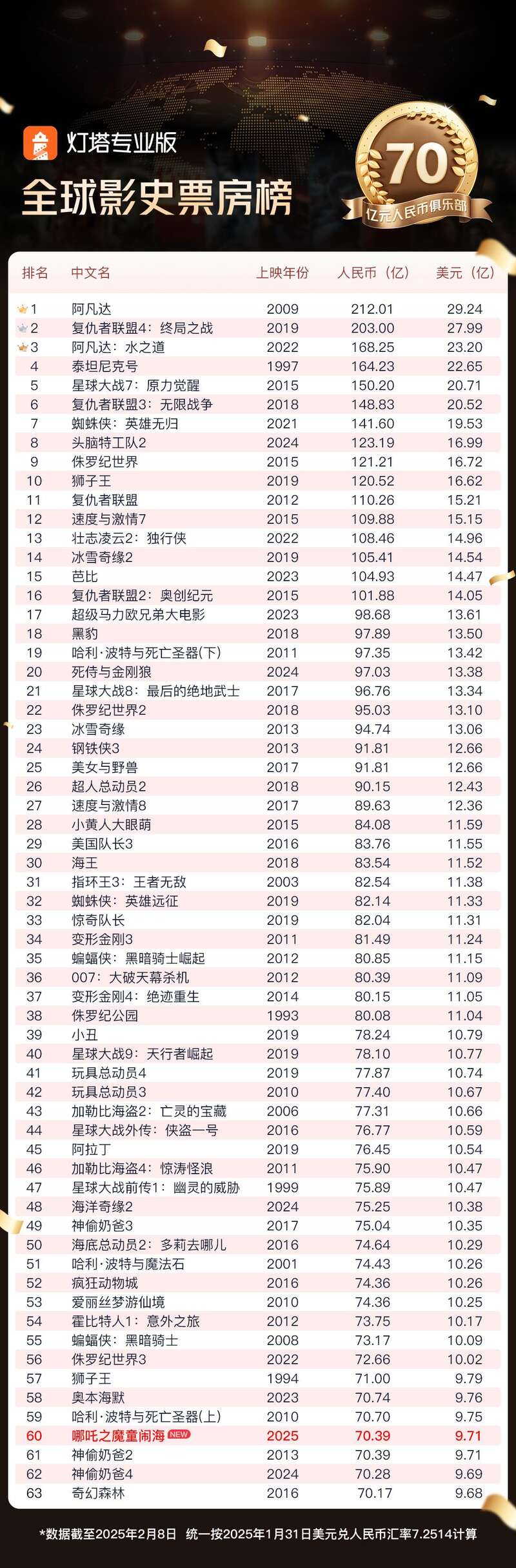 据网络平台数据,截至2月8日,影片《哪吒之魔童闹海》票房(含预售)突破70.39亿元,超过《神偷奶爸2》进入全球影史票房前60!