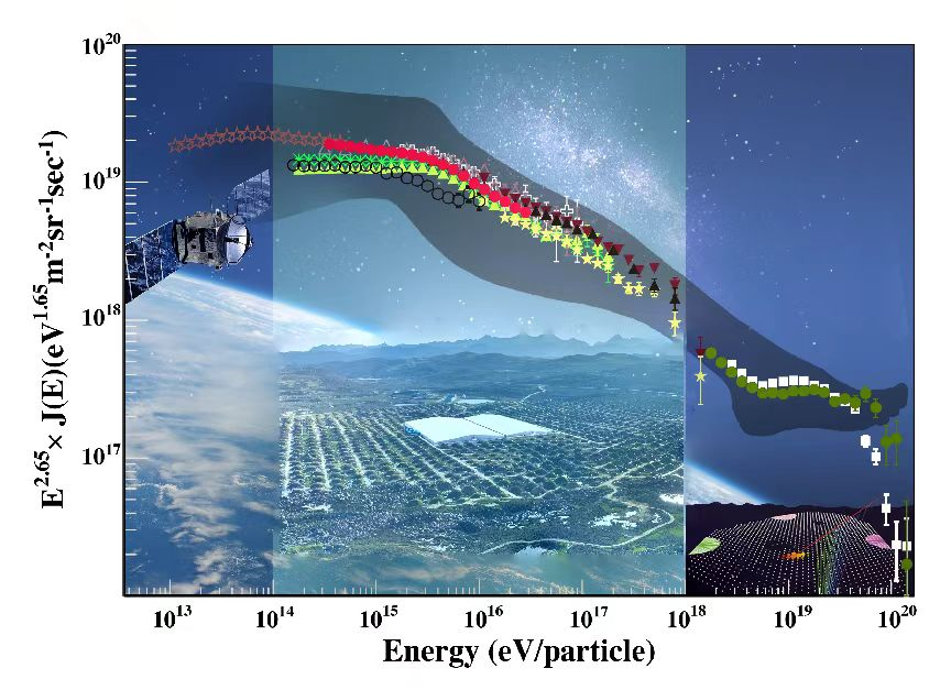 什么是宇宙线能谱的“膝”?上世纪 50 年代末,科学家发现当宇宙线能量超过4千万亿电子伏后,能谱幂指数开始减小,形成一个类似人膝盖的拐点,这就是 “膝”。能谱“膝”结构与宇宙线的来源及在宇宙空间中的旅行方式密切相关,但探测“膝”区宇宙线面临诸多困难。