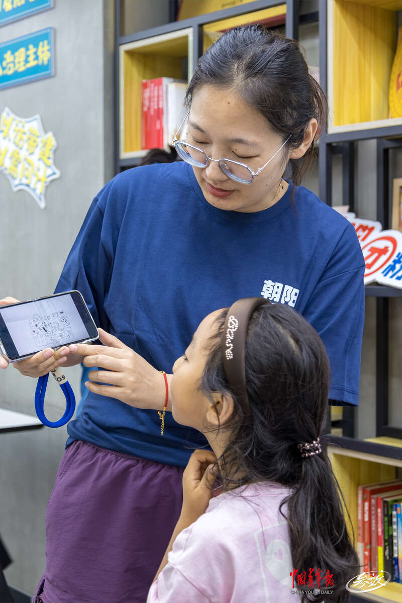 在收纳课后,一名学员正在和她的女儿一起看刚刚画的行李箱收纳图。实习生 曲帆/摄