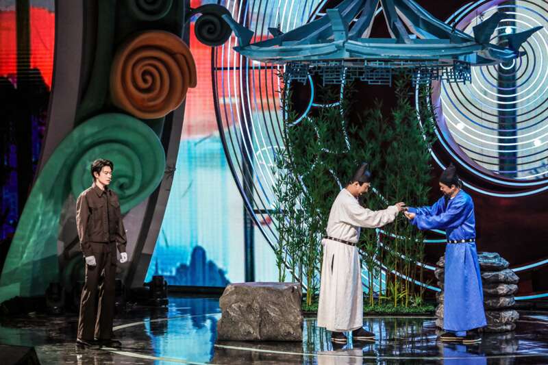 数字穿越秀《千年摩崖》以科技赋能文化,魏大勋化身数字修复师,与唐朝诗人元结及其好友颜真卿对话,探寻千年摩崖的数字焕新。张璇和湖南省京剧传承保护中心带来的戏曲《皿方罍·再无别离》选段,用京剧演绎“方罍之王”皿方罍流浪百年终得归的国宝回家故事。
