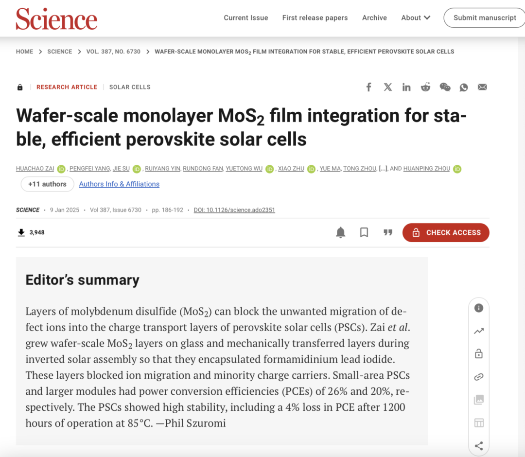 1月9日,北京大学周欢萍教授、张艳锋教授(共同通讯作者)在science上发表了题为“wafer-scale monolayer mos2 film integration for stable, efficient perovskite solar cells”(晶圆级单层mos2薄膜集成实现稳定、高效的钙钛矿太阳能电池)的研究论文。1月16日,周欢萍教授为独立通讯作者,再度在science发表了题为“nonalloyed α-phase formamidinium lead triiodide solar cells through iodine intercalation”(通过碘嵌入制备非合金α-fapbi3太阳能电池)的研究论文。这是science期刊在一周之内连续两次刊发周欢萍团队在钙钛矿太阳能电池领域的研究进展。