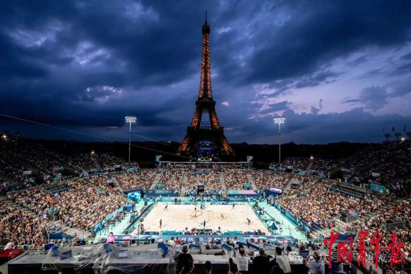 当地时间8月1日傍晚,法国巴黎埃菲尔铁塔体育场,奥运会沙滩排球小组赛正在进行,暮色下的铁塔亮起灯光,与赛场交相辉映。埃菲尔铁塔是为1889年世界博览会而建的,距今已有100余年历史。2024年巴黎奥运会和残奥会期间,这个在铁塔脚下临时建造的室外体育场是沙滩排球和盲人足球的比赛场地。中青报·中青网记者 李隽辉/摄