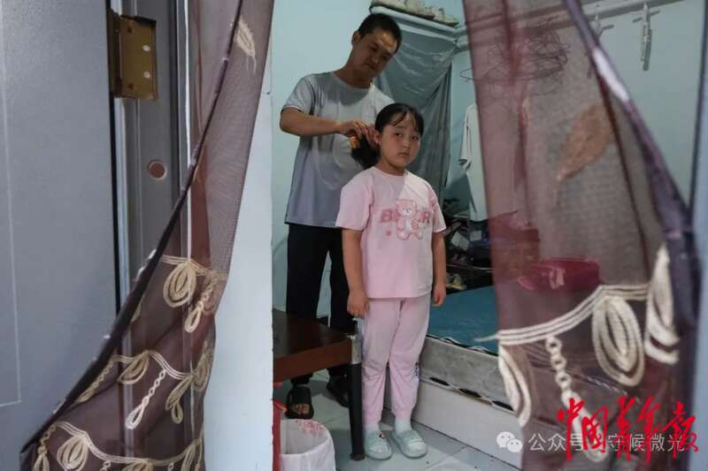 8月17日下午,北京市老君堂村,路峰在出租屋里给女儿路沐婷梳头发。当天下午,他骑电动车带着女儿在烈日下跑了3个小时,送了8单外卖、2单“跑腿”,配送里程超过20公里。等红绿灯时,路峰抢到了次日凌晨搬运货架的订单,预计能挣200元,于是他决定提前结束跑单,带女儿回家休息。一个月前,路沐婷来到北京东南四环外老君堂村小哥加油站,在这里的社区夏令营当起了“插班生”。今年暑假,7岁的她第一次离开老家,来到爸爸路峰工作的地方。实习生 王藜静/摄