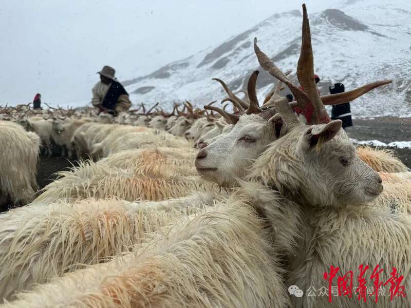 9月13日,西藏阿里地区日土县热帮乡龙门卡村,牧民们动作熟练地将200多只羊绑在一起,便于给羊快速挤奶。尽管大雪纷飞,但在捆绑过程中,羊群依旧十分配合,有的甚至主动凑上前去。阿里地区是西藏重要的畜牧业主产区之一,销往各地的牛羊肉、羊绒、酥油等,是当地牧民的主要收入来源。中青报·中青网记者 石佳/摄