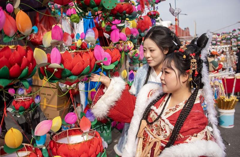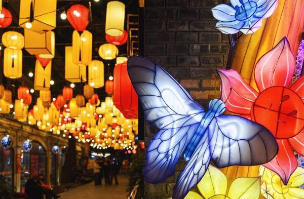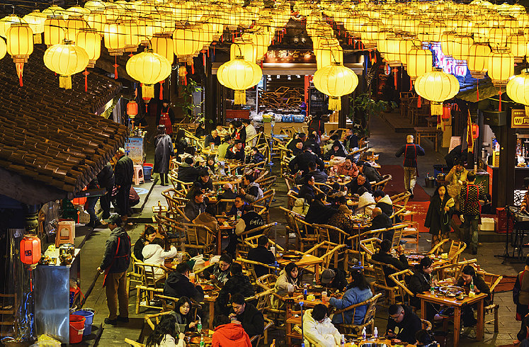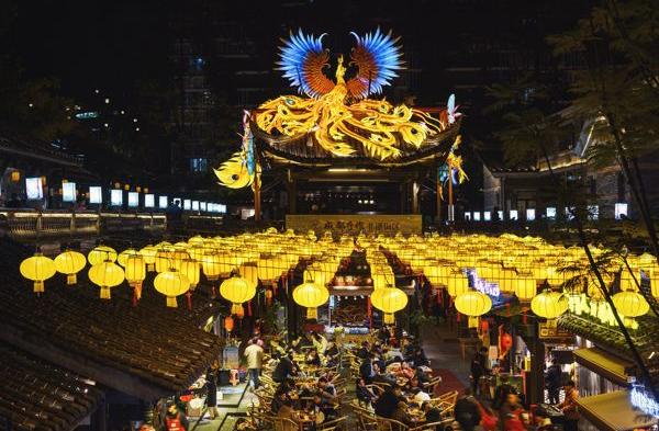 成都:东门市井年味浓 民众灯下吃茶赏花灯